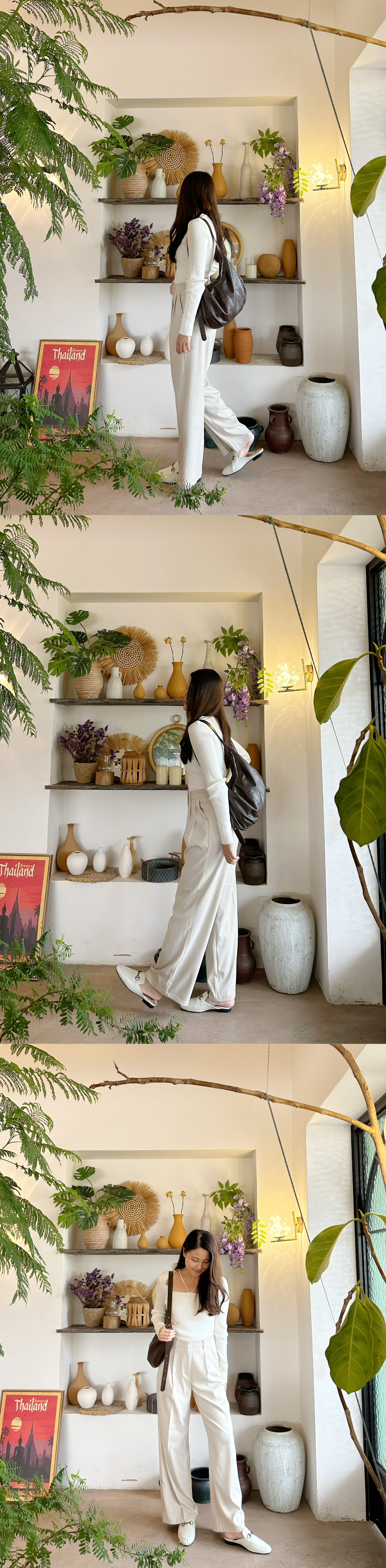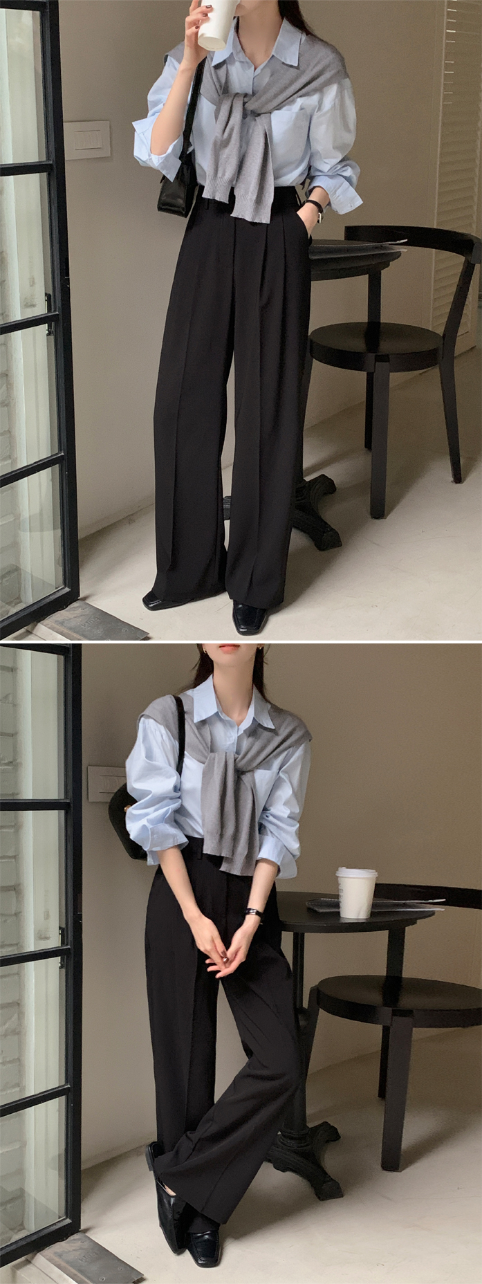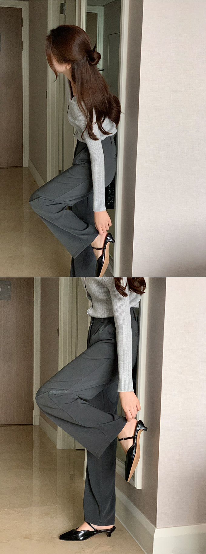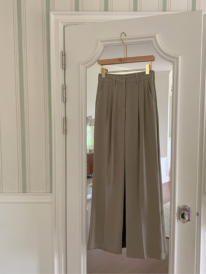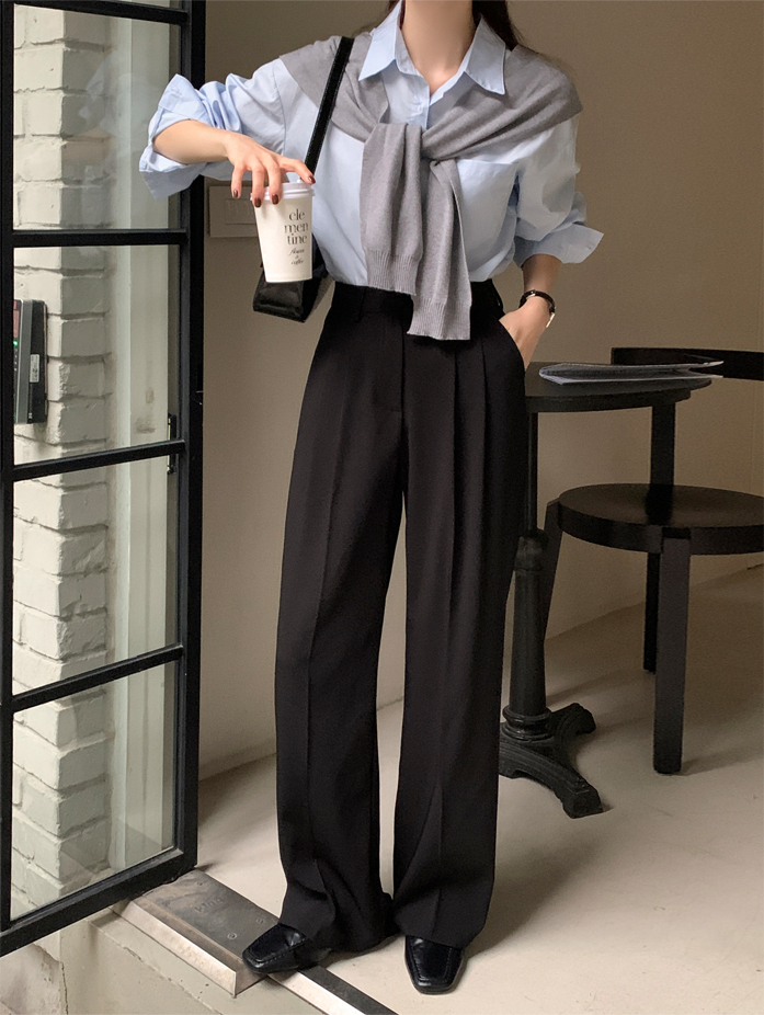 高腰半直筒寬褲版型,褲檔有兩道摺處理,
