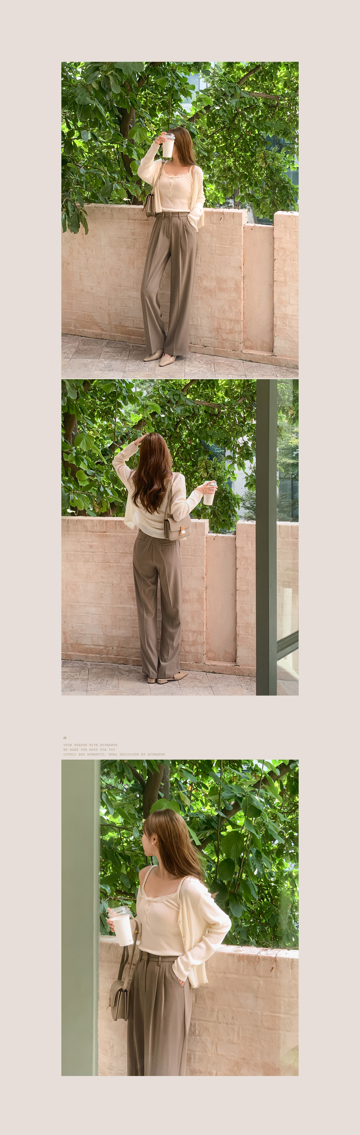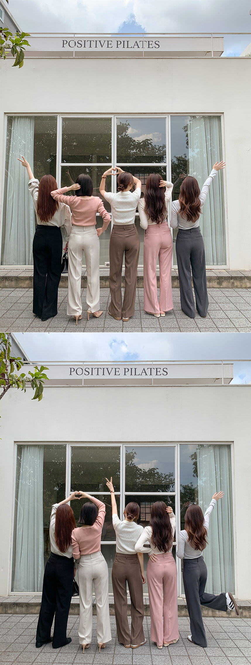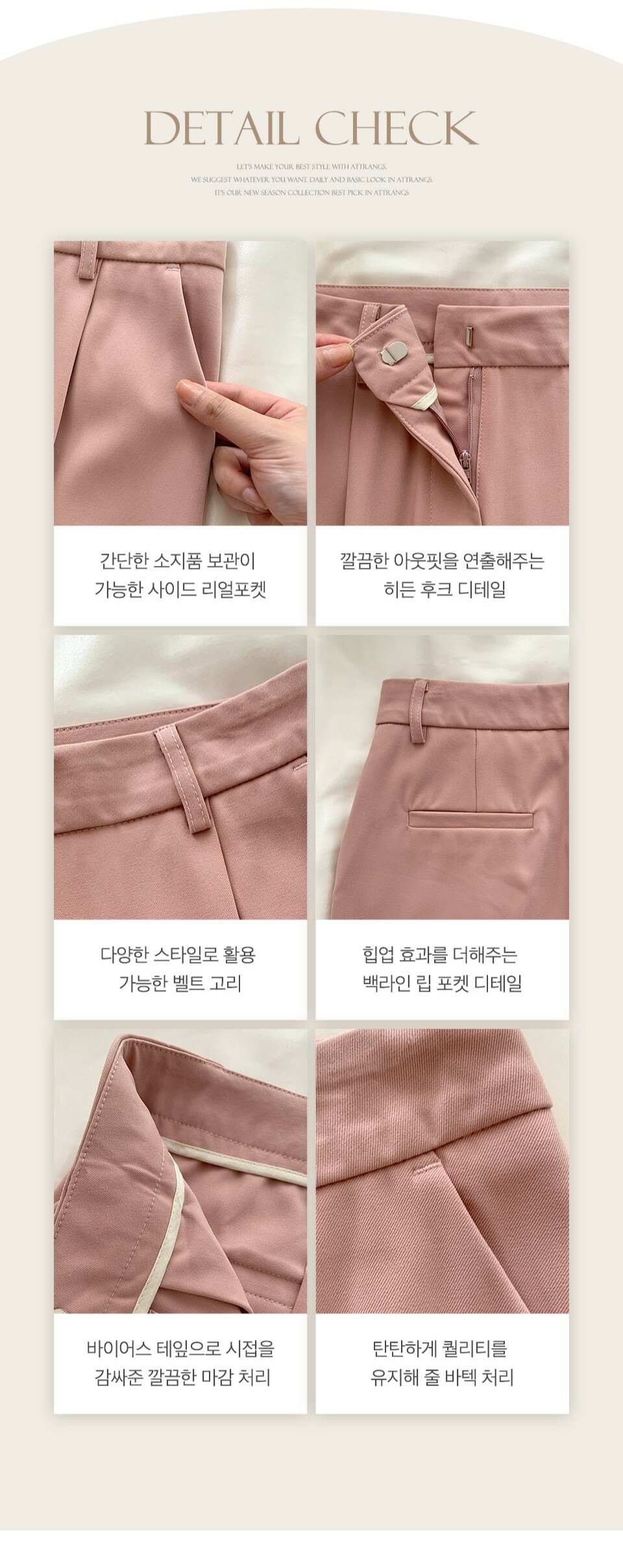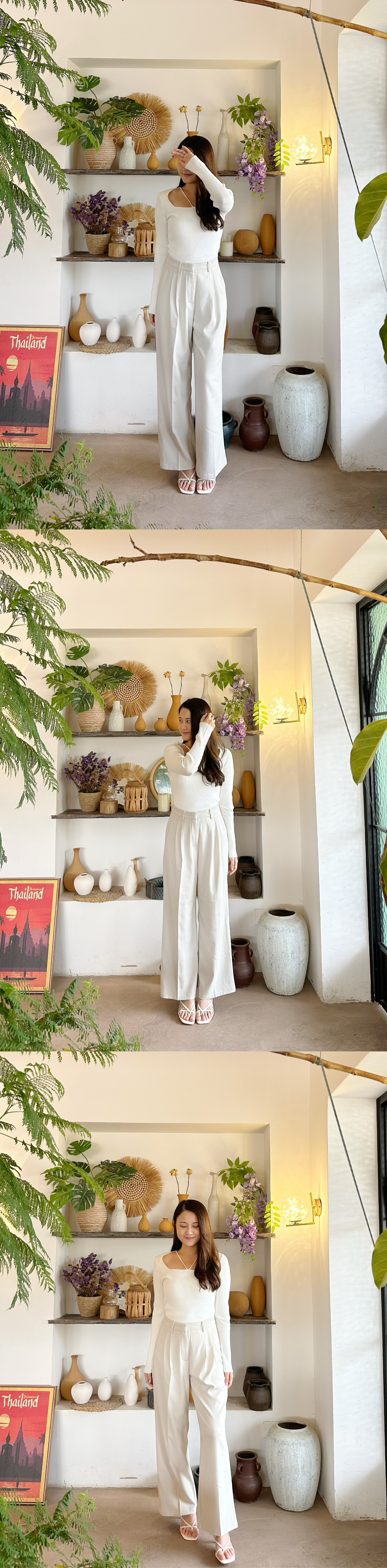 高腰半直筒寬褲版型,褲檔有兩道摺處理,