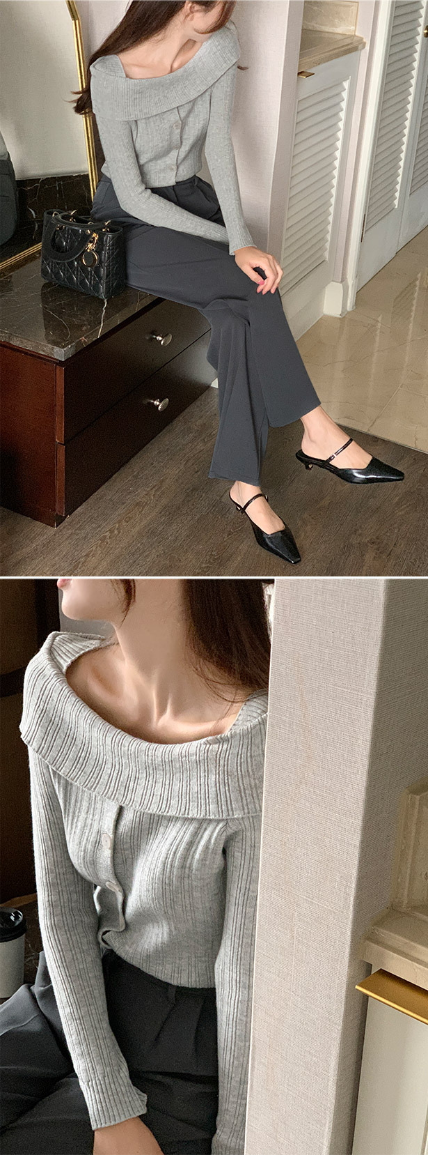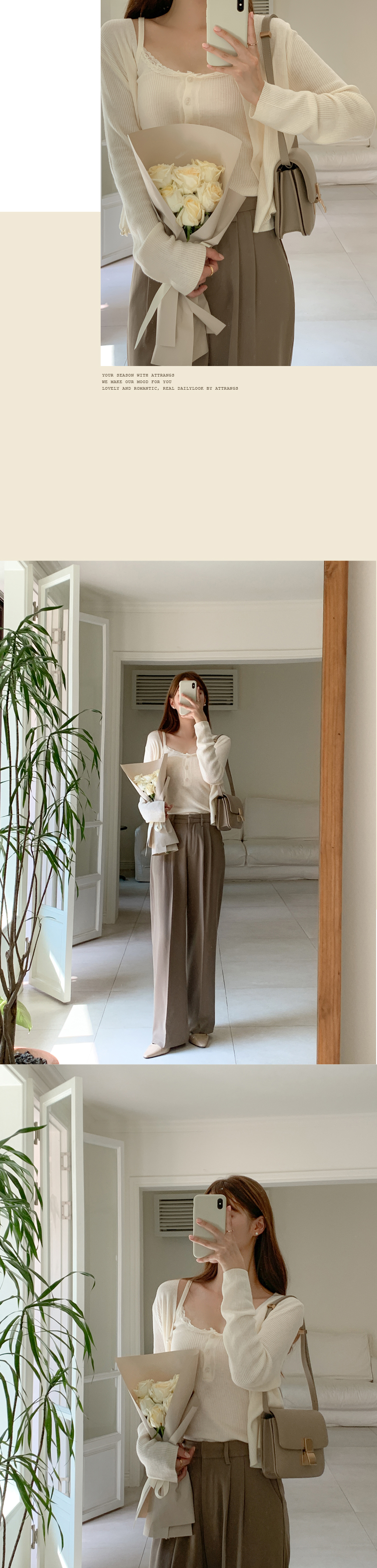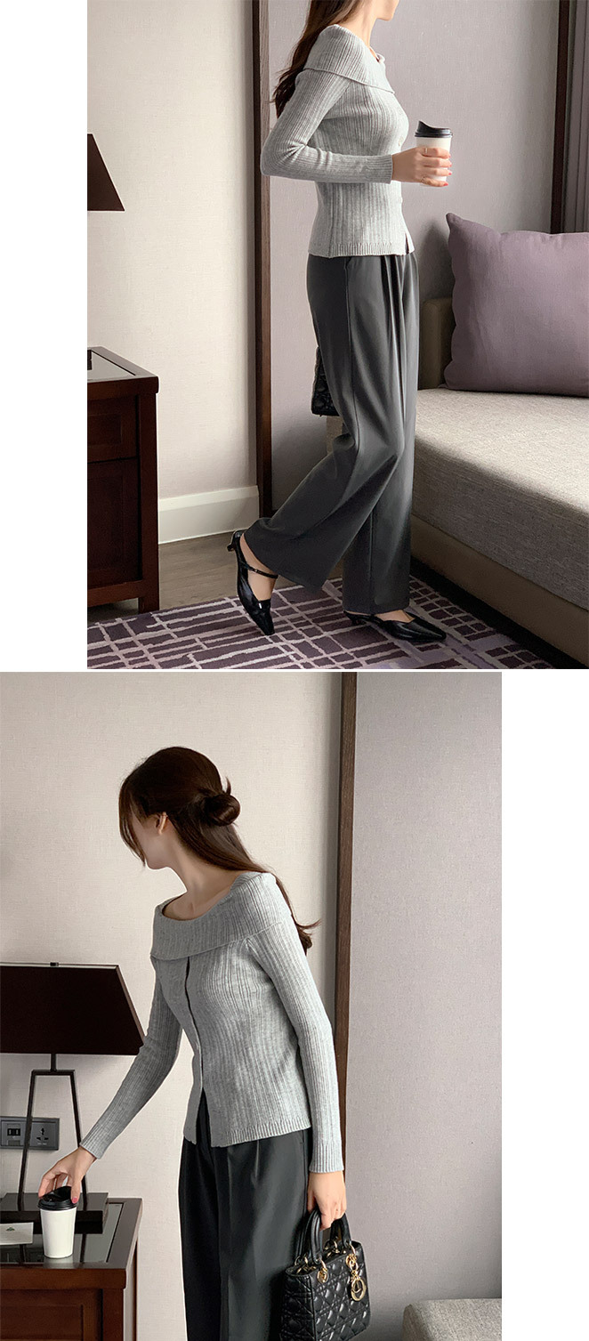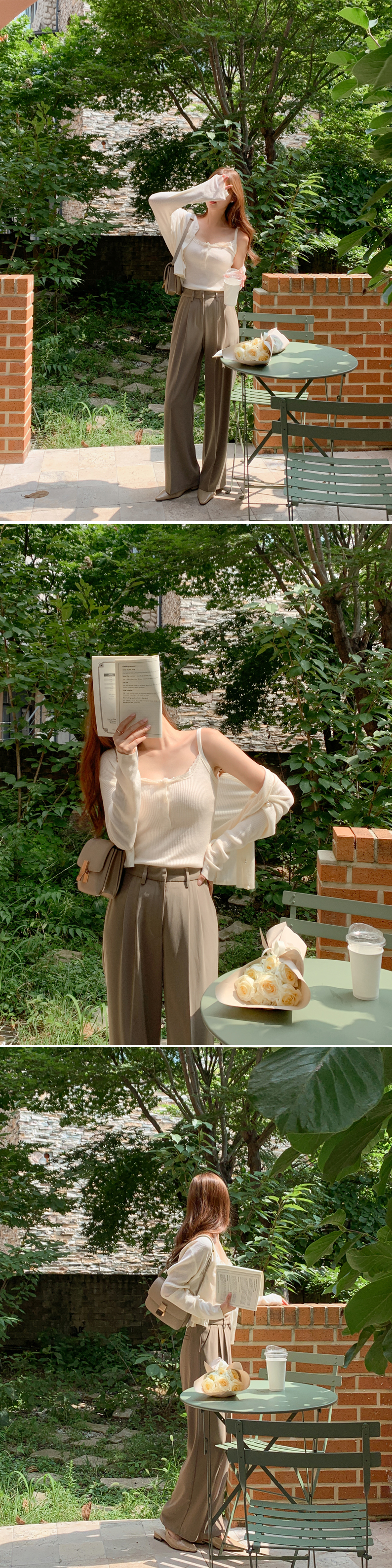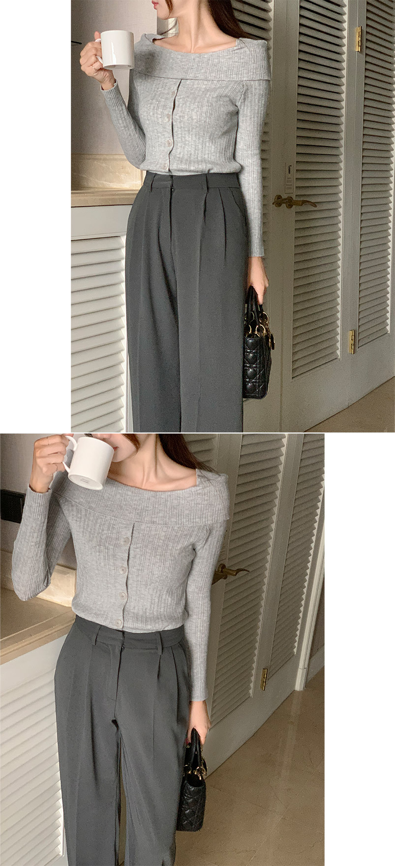 高腰半直筒寬褲版型,褲檔有兩道摺處理,