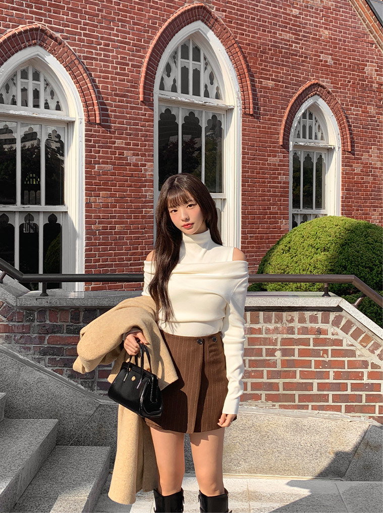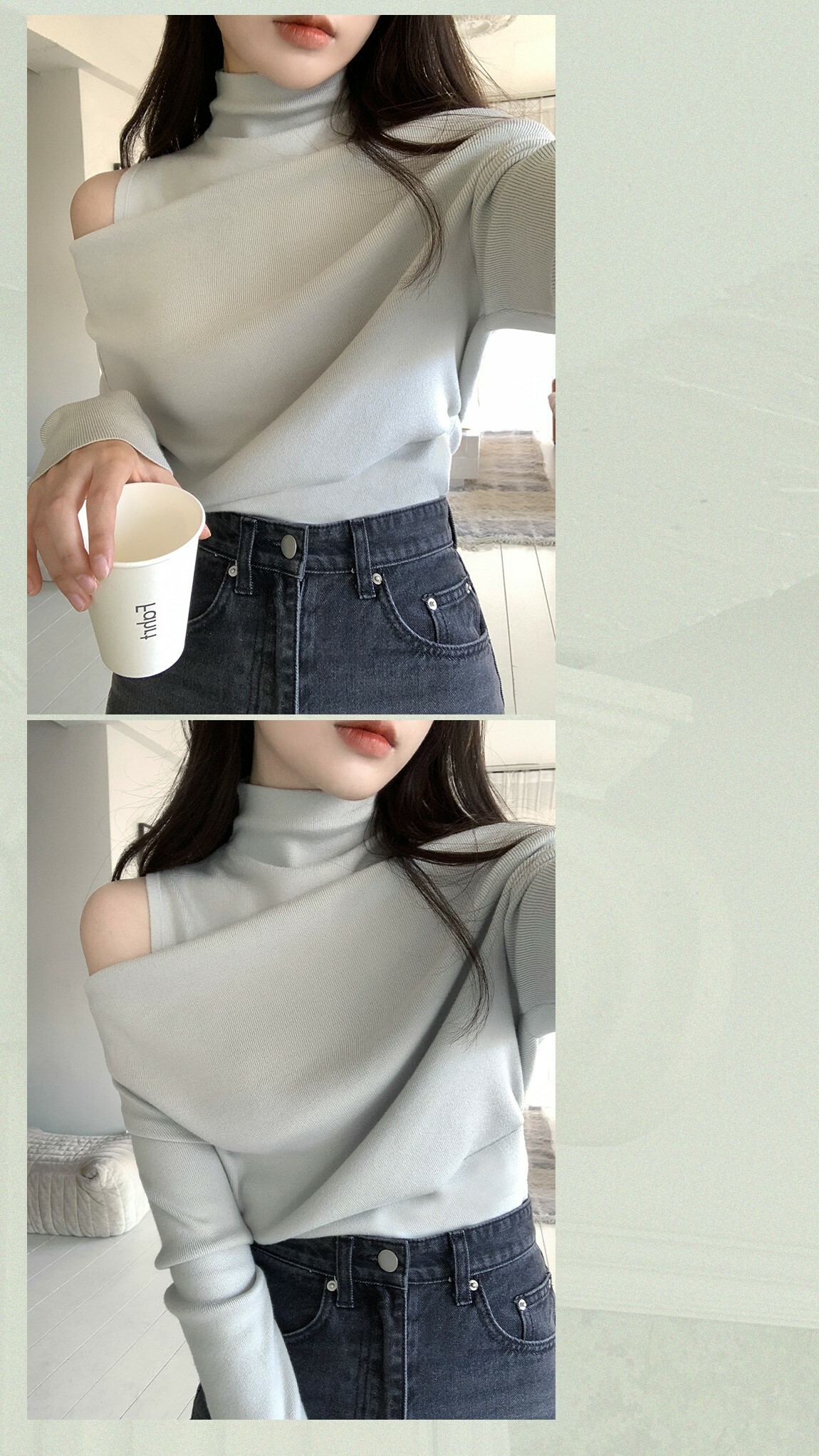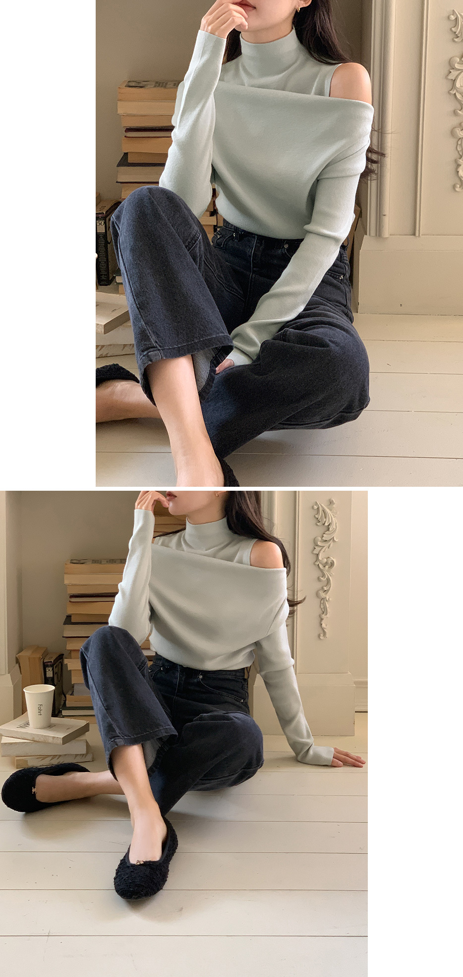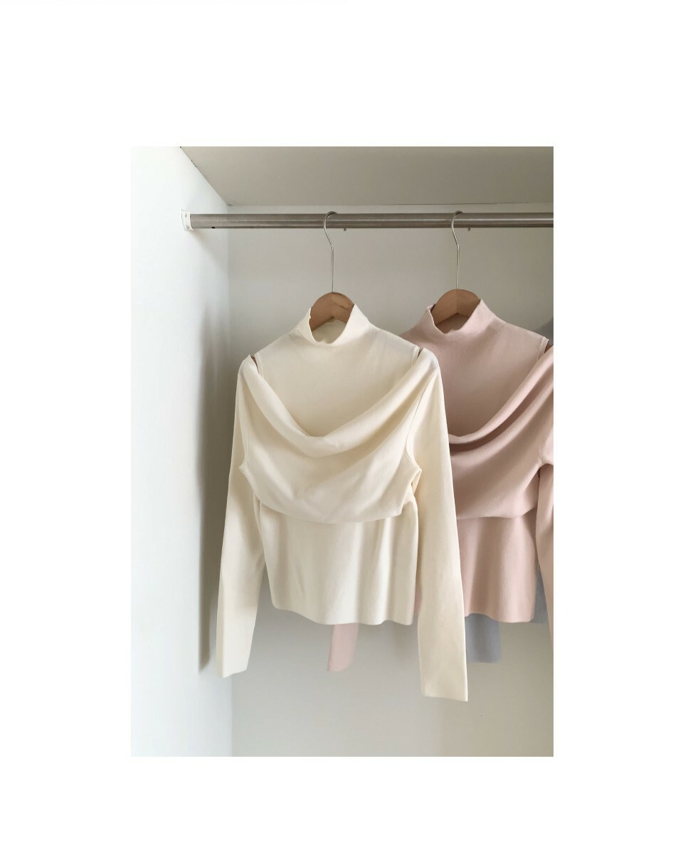 這是一款帶有高領露肩部細節、充滿女性氣質的針織品。