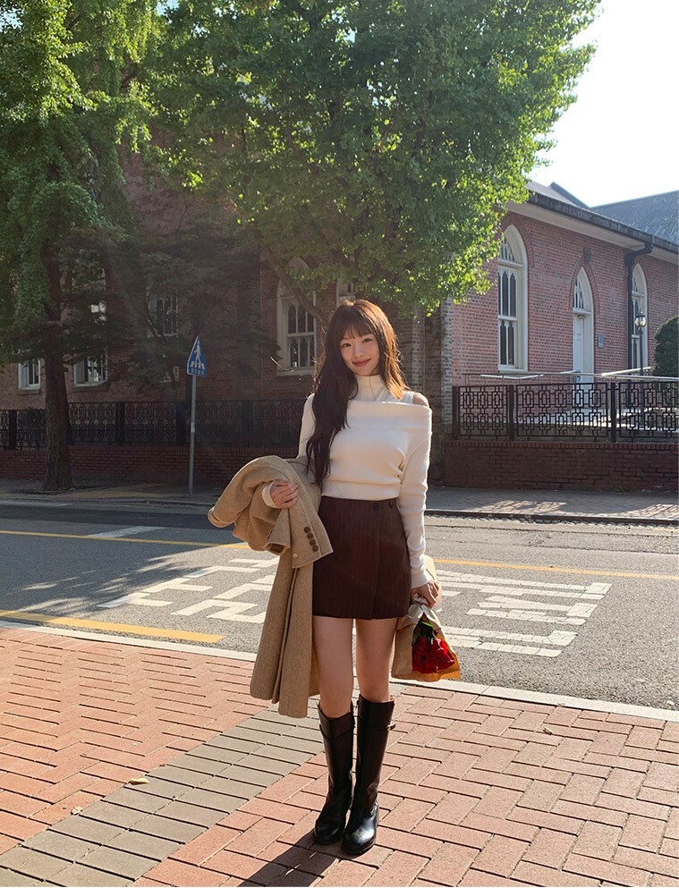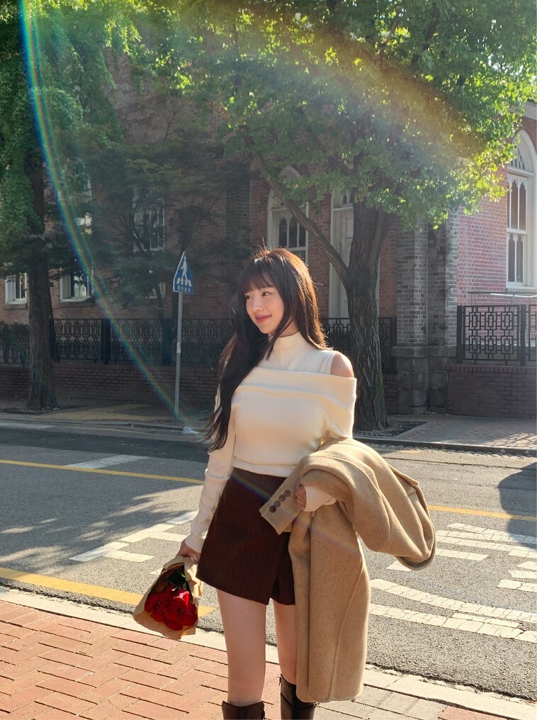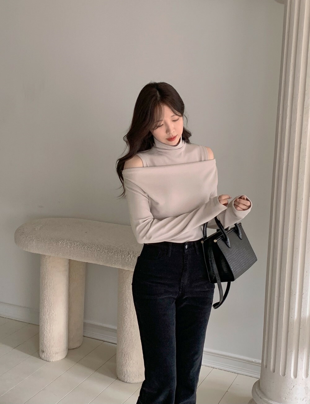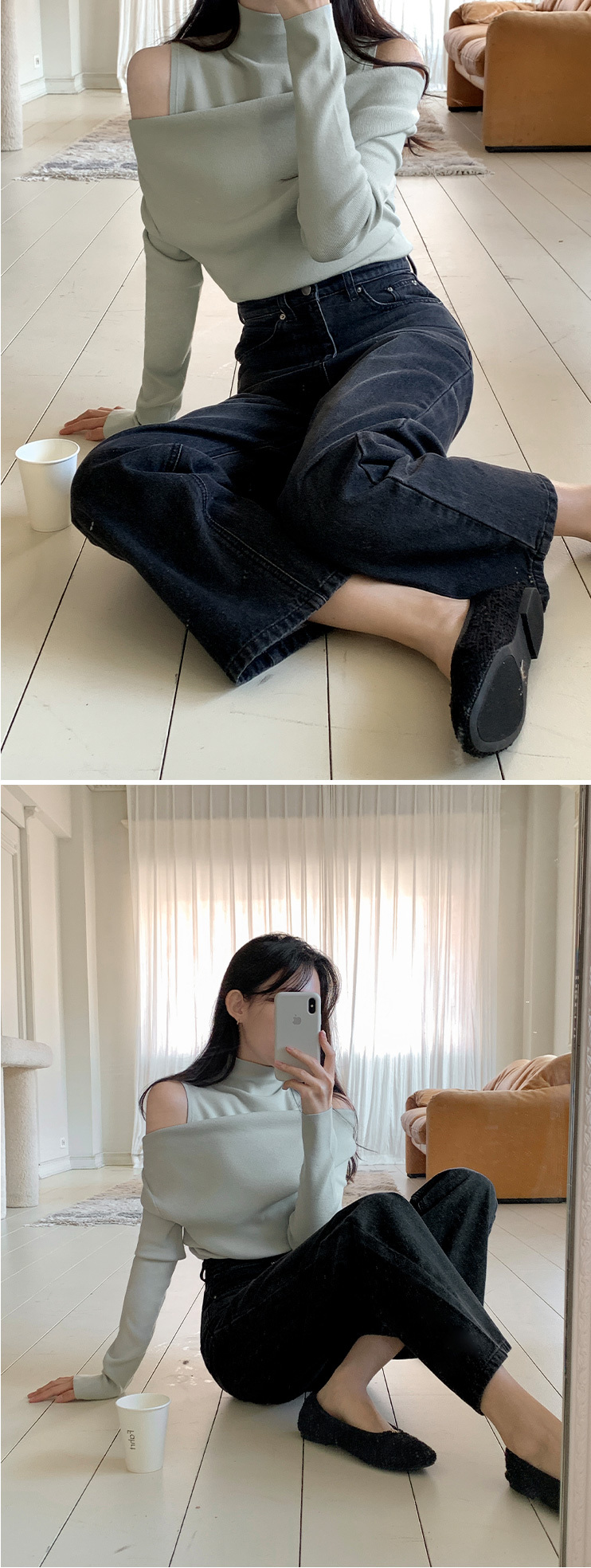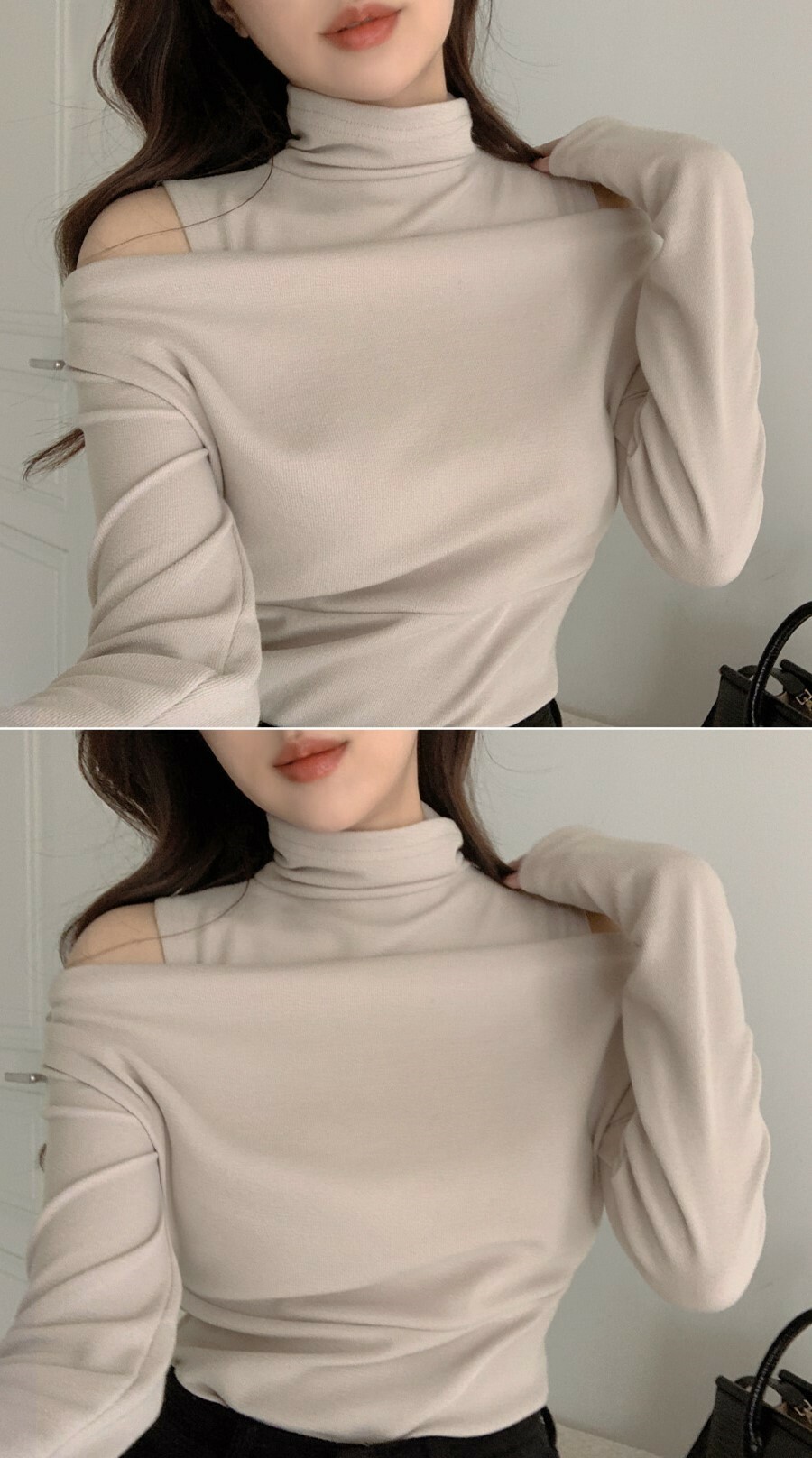 這是一款帶有高領露肩部細節、充滿女性氣質的針織品。