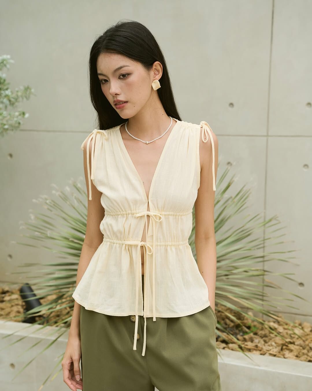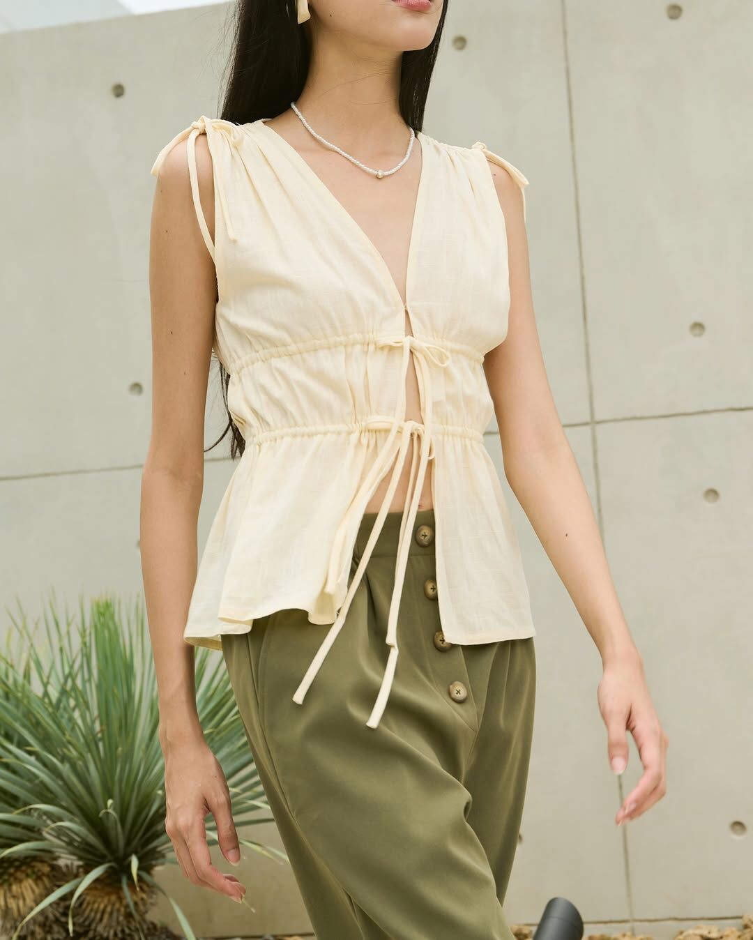 法式夏日鬆弛感滿滿的 V領雙綁帶收腰背心~