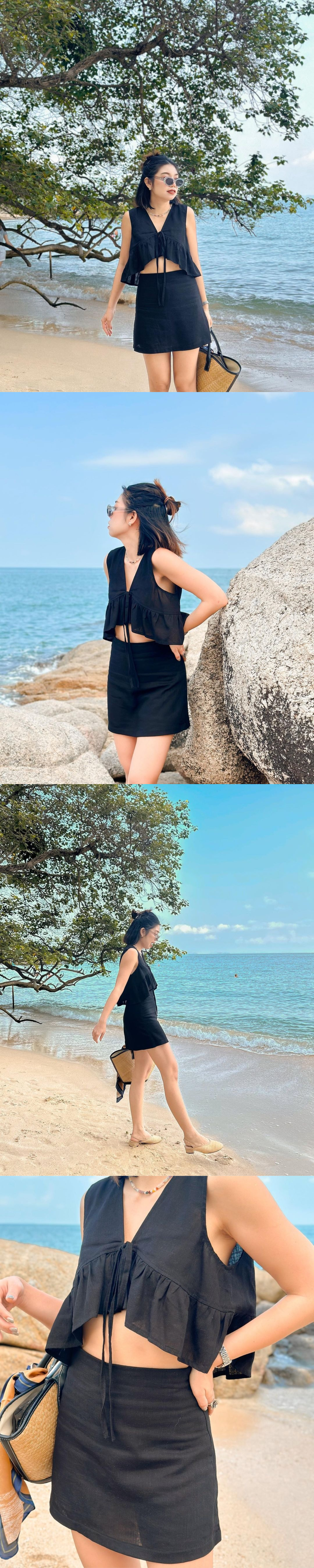 棉麻綁帶Blouse+高腰Skort套裝♡